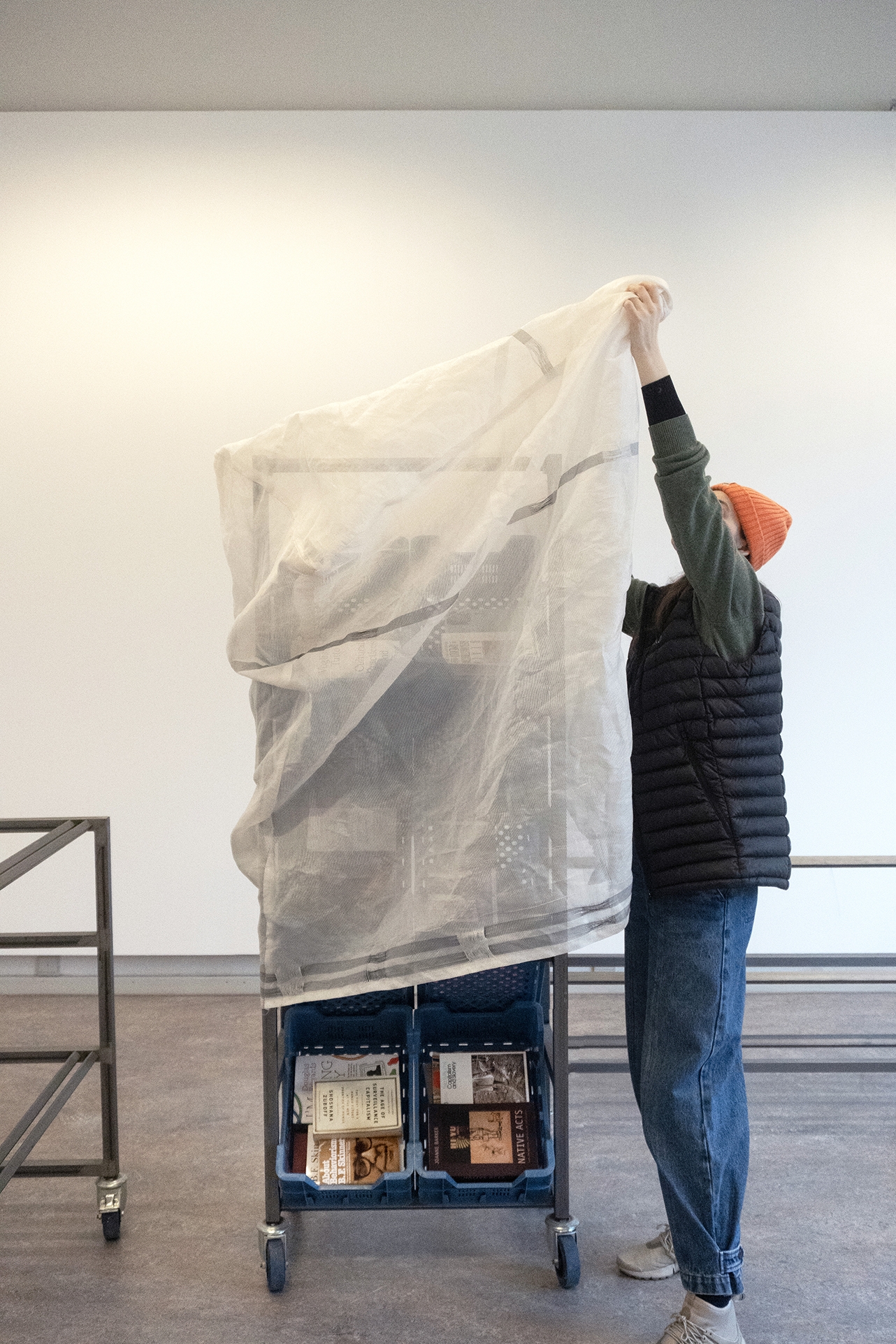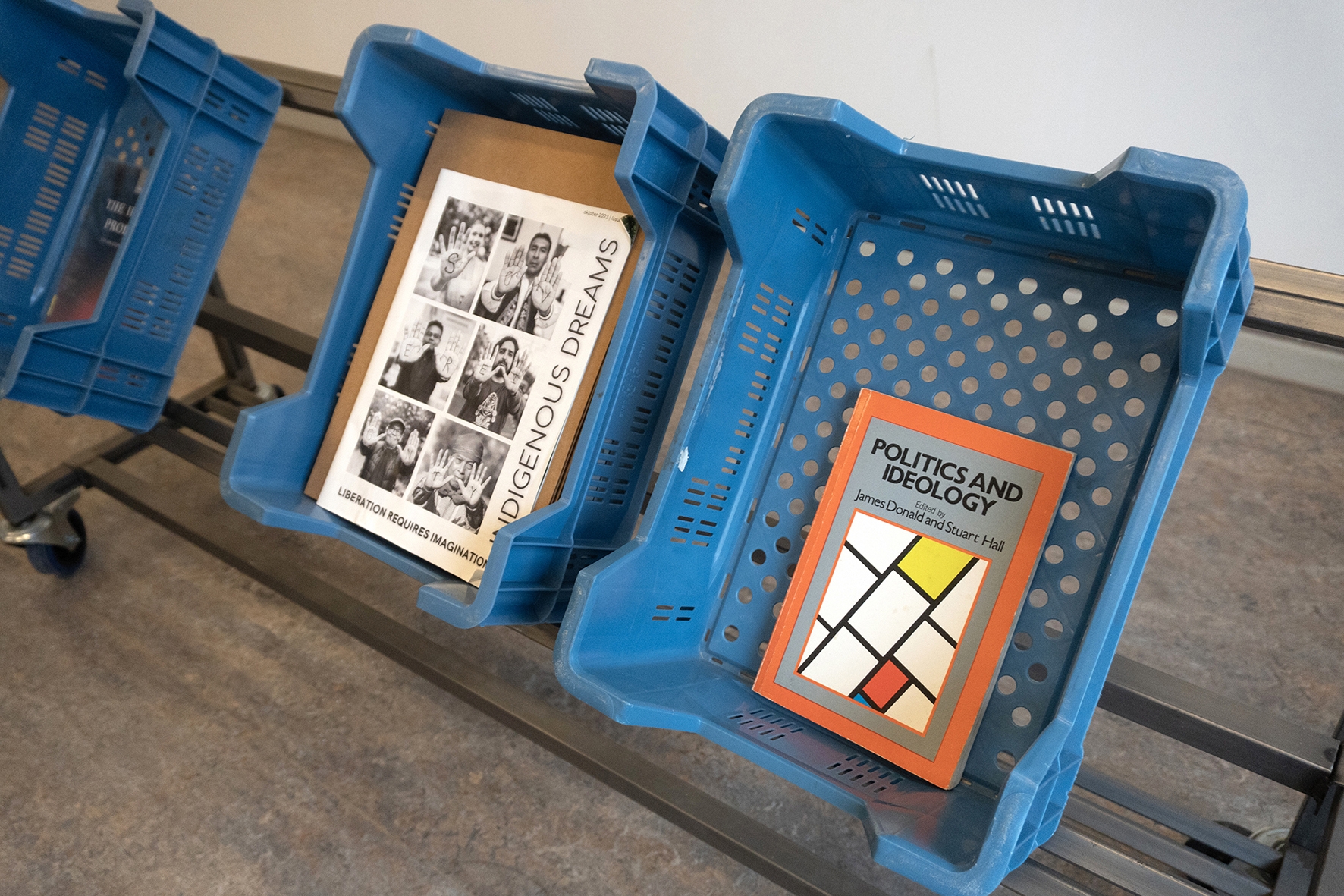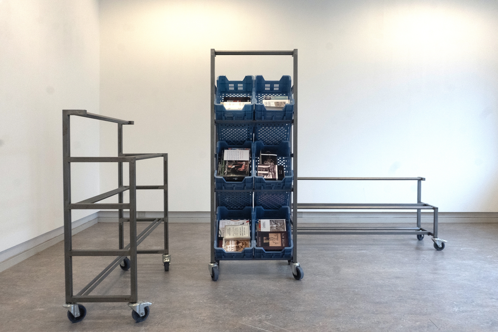 This project is a small library setup part of the flexible scenography for the reading groups organised by That Might be Right. Critical literature about capitalism, land and ownership is partially taken as inspiration to tap into an existing reusable crate system, setup for market vendors to ship store and display their produce. The metal market stall is taken as inspiration for the bookshelf structures, which form, together with the already created sitting-bags and lamps, a small family of functional forms welcoming readers to look at the library, sit down and read, wherever the material is setup.