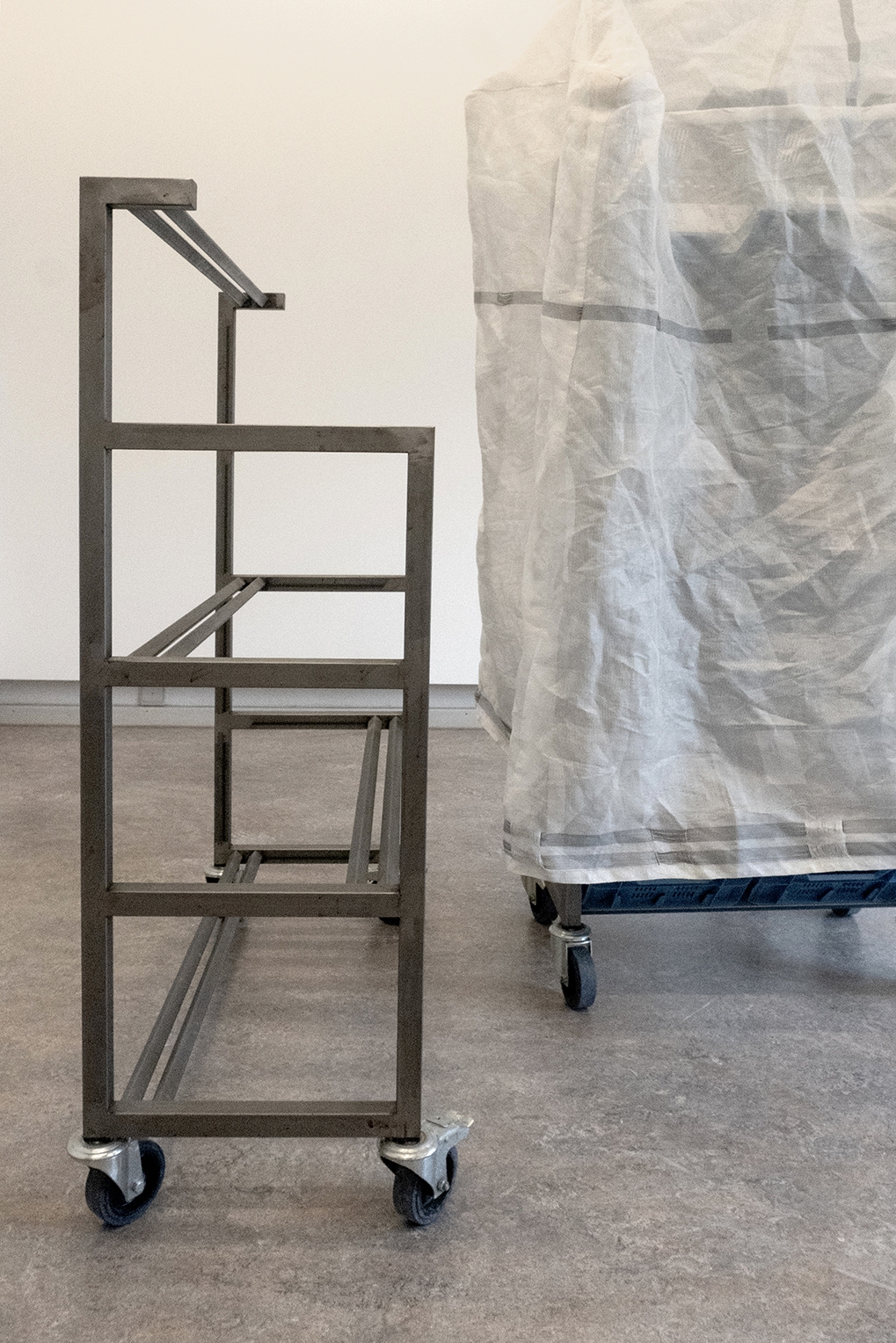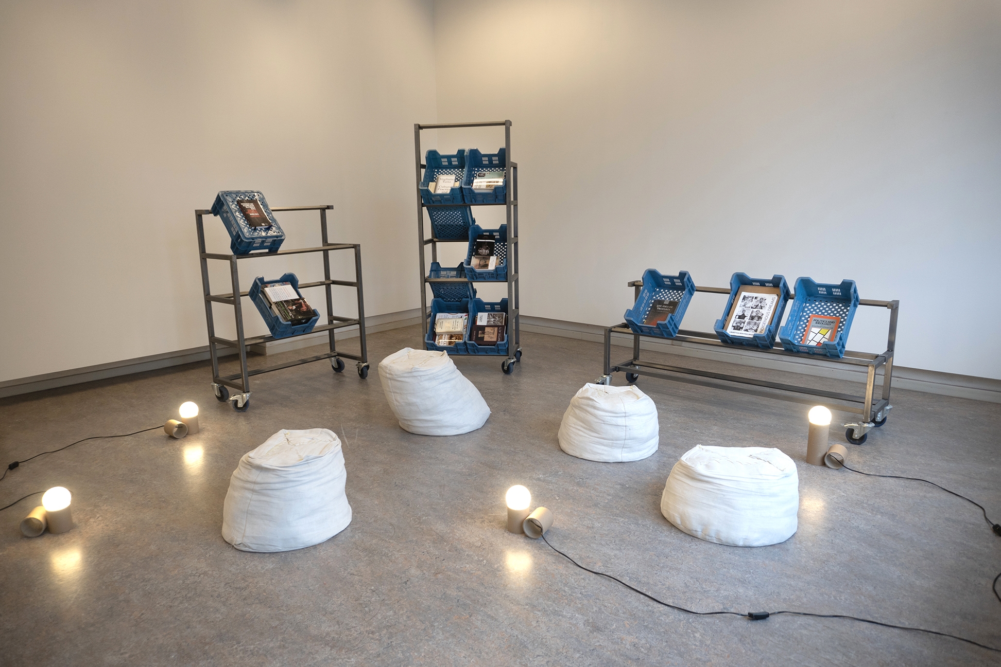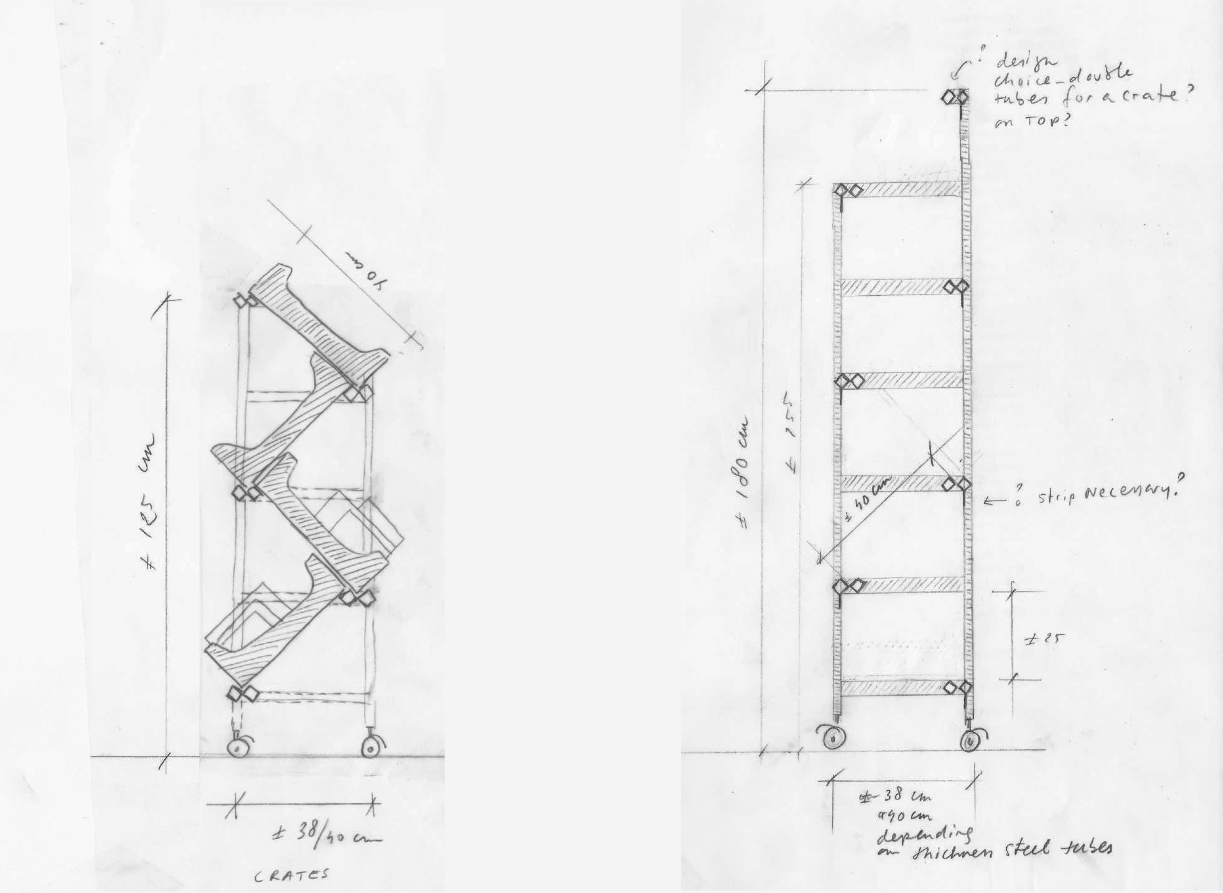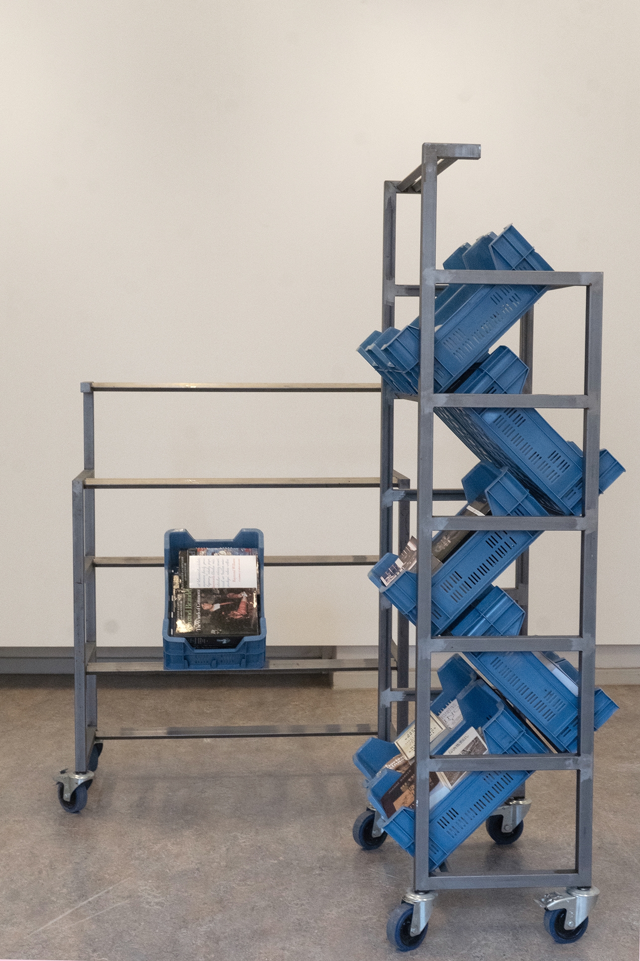 This project is a small library setup part of the flexible scenography for the reading groups organised by That Might be Right. Critical literature about capitalism, land and ownership is partially taken as inspiration to tap into an existing reusable crate system, setup for market vendors to ship store and display their produce. The metal market stall is taken as inspiration for the bookshelf structures, which form, together with the already created sitting-bags and lamps, a small family of functional forms welcoming readers to look at the library, sit down and read, wherever the material is setup.